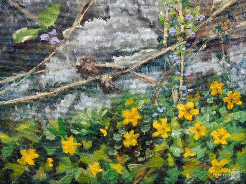 Here is a little plein air painting I did while out enjoying the Spring air. A lovely wall near the cemetery on the outskirts of town. Very peaceful and serene, with the lovely texture, old vines, and all these beautiful spring flowers clinging to near and to it.. Just looking at it gave me a feeling of happiness at the loveliness of the landscape.