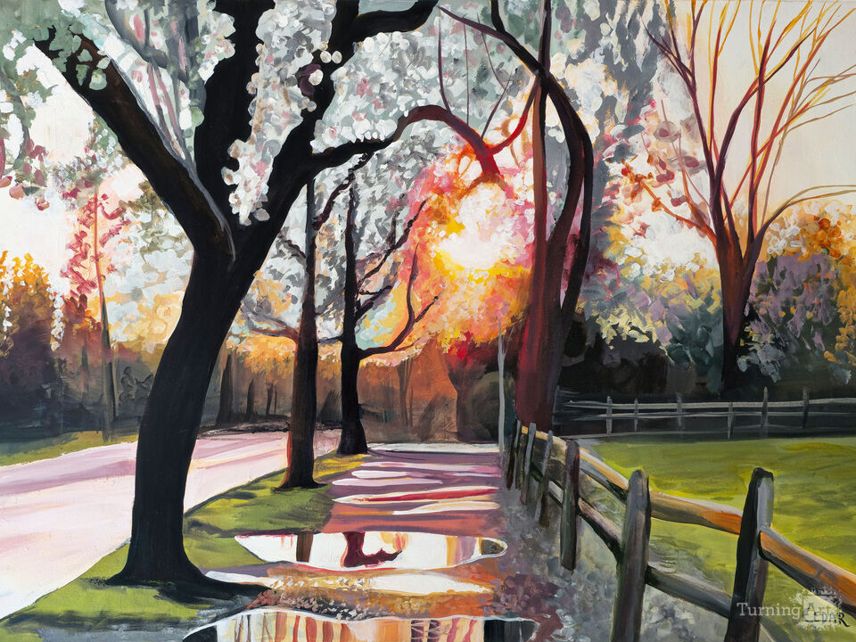 This colorful painting, Spring Puddles, is inspired by the beautiful streets of Portland, Oregon in the spring. In the springtime, this row of trees is full of showy white blossoms, and after a rain, the pathway fills up with puddles. This art will fill a big wall with joyful color!