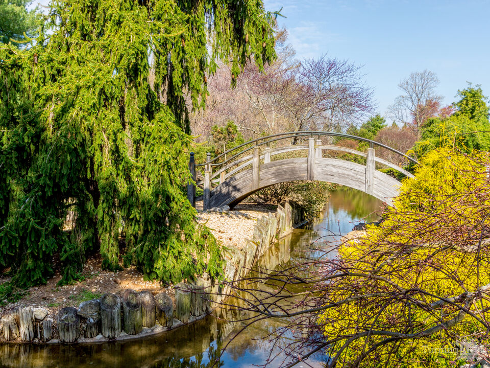 Captured during the spring season, the surrounding trees and shrubs are just beginning to turn green as fresh foliage returns after winter. Hints of soft seasonal color appear among the branches, signaling the arrival of warmer days. The gentle curve of the moon bridge and the calm pond below create a serene focal point, making this Japanese-inspired garden a perfect place to slow down and enjoy the quiet beauty of spring.