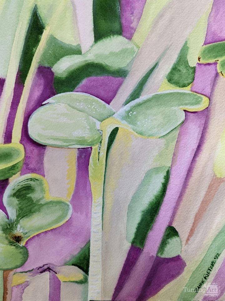 In 2022 when a local chef opened a market for microgreens and lettuces, Jeanne had the opportunity to photograph the produce. She turned those images into a series of small paintings. She even mixed her own greens and purples to best imitate the colors of the plants.