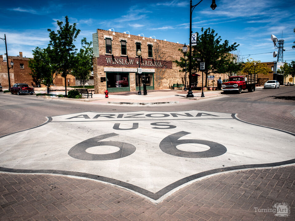 A massive Route 66 shield is painted directly onto the brick pavement of downtown Winslow, Arizona, with the historic "Winslow, Arizona" building — immortalized in the Eagles song "Take It Easy" — visible directly across the intersection. Classic cars, modern trucks, and period street furniture populate the background, grounding the image in a present-day Main Street that has been lovingly preserved as a Route 66 destination. The low-angle perspective dramatically foregrounds the iconic shield, making the viewer feel as though they are standing at the crossroads of American myth and history. This is one of the most recognizable intersections in the American West, and this image captures it with the drama and affection it deserves.