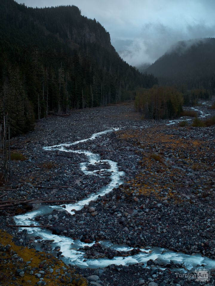 A quiet creek winds through volcanic rubble, framed by dark pines and a brooding sky. While this scene looks calm, hidden behind the fog is mighty Mt. Rainier, and pressure is building.