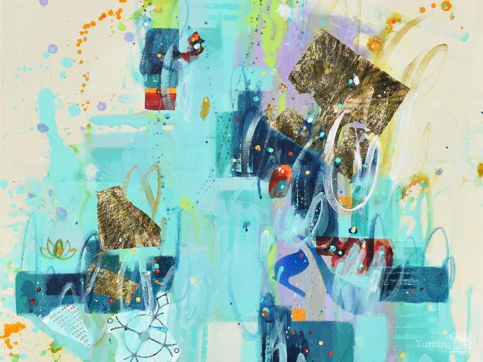 Stillness Speaks is a meditation on transformation, possibility, and the boundless nature of existence. Geometric forms and layered collage intersect with gold leaf, weaving visual references to Buddhism, astrophysics, microbiology, and space-time theory. Together, these elements reflect the ways we perceive and shape reality.