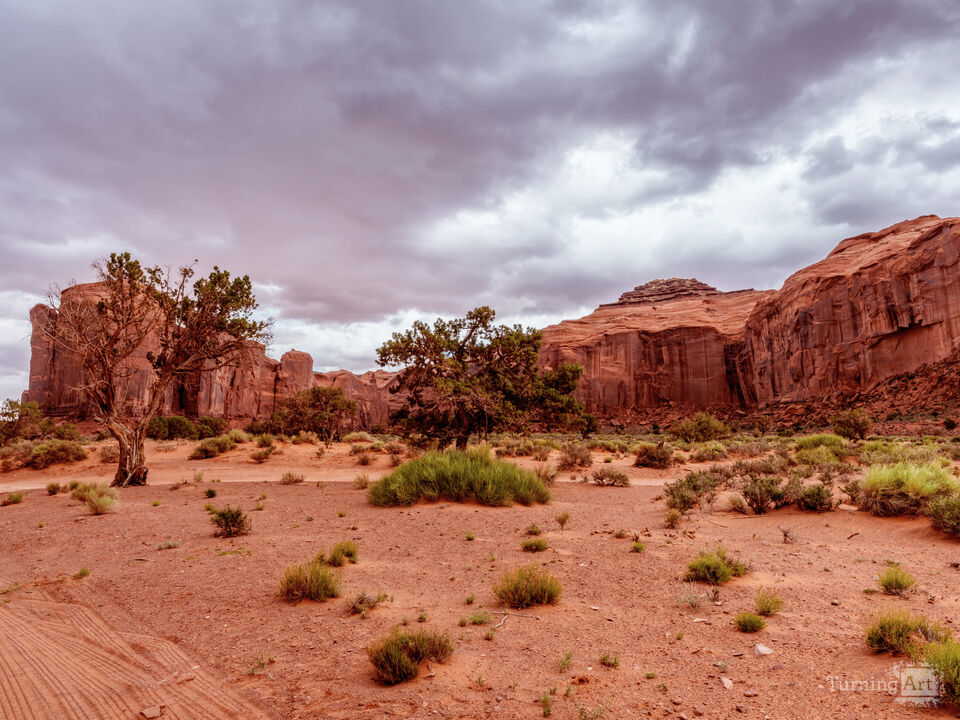 Spring storm clouds rolled in quickly while we were exploring Monument Valley in Navajo Tribal Park, located in northeast Navajo County, Arizona, United States. In the foreground, a weathered cedar and juniper tree stands against the dramatic backdrop of Spearhead Mesa. The deep purples and blues in the approaching storm clouds contrast beautifully with the warm orange tones of the desert landscape and sandstone formations. Not long after I captured this scene, the temperature dropped, the sky opened up with hail, and the storm shifted into sleet with a mix of snow—a wild and unforgettable desert moment.