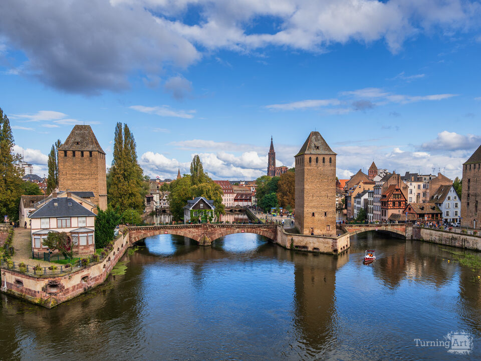Picturesque city of Strasbourg in Alsace, France. Skyline with Ponts Couverts – Covered Bridges and medieval towers at River Ill. Part of the historic Petite France quarter, these fortified bridges were opened in 1250 and originally covered with a wooden roof that was removed in 1784, but the name "Covered Bridges" remained.