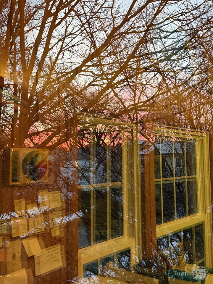 This photograph is a part of a series I took of the view from my studio window. Reflections play a part in every image in the series to varying degrees. The interior of the room is reflected in the windows, where one can see the treetops of my yard at sunset. The warm yellow wood panels in the studio, my colorful supplies, and a painting on my easel cast particular hues onto the landscape that otherwise would not exist. I love this in-between, dreamlike time of day. The images invite imagination.
