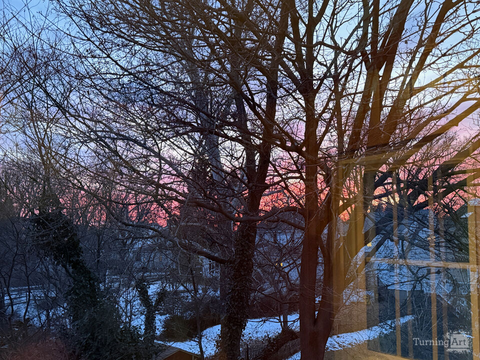 This photograph is a part of a series I took of the view from my studio window. Reflections play a part in every image in the series to varying degrees. The interior of the room is reflected in the windows, where one can see the treetops of my yard at sunset. The warm yellow wood panels in the studio, my colorful supplies, and a painting on my easel cast particular hues onto the landscape that otherwise would not exist. I love this in-between, dreamlike time of day. The images invite imagination.
