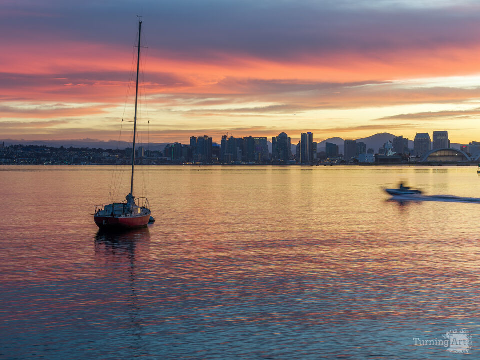 A serene view of a sailboat in San Diego Bay with the city skyline in the background. The vibrant colors of the sunrise reflect on the calm waters. Fine art photography by a San Diego native. Thank you for your interest in my work.