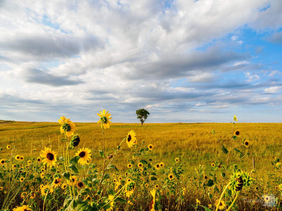 This photograph was taken near the end of summer on the prairie during a moment when everything feels warm and full, but you can already sense the season beginning to shift. The sunflowers were standing tall in the breeze, almost like they were soaking up every last drop of golden light before autumn arrived. And that lone tree in the distance felt like an anchor in all that open space, a reminder that even in the vastness, there’s always something steady to hold onto.