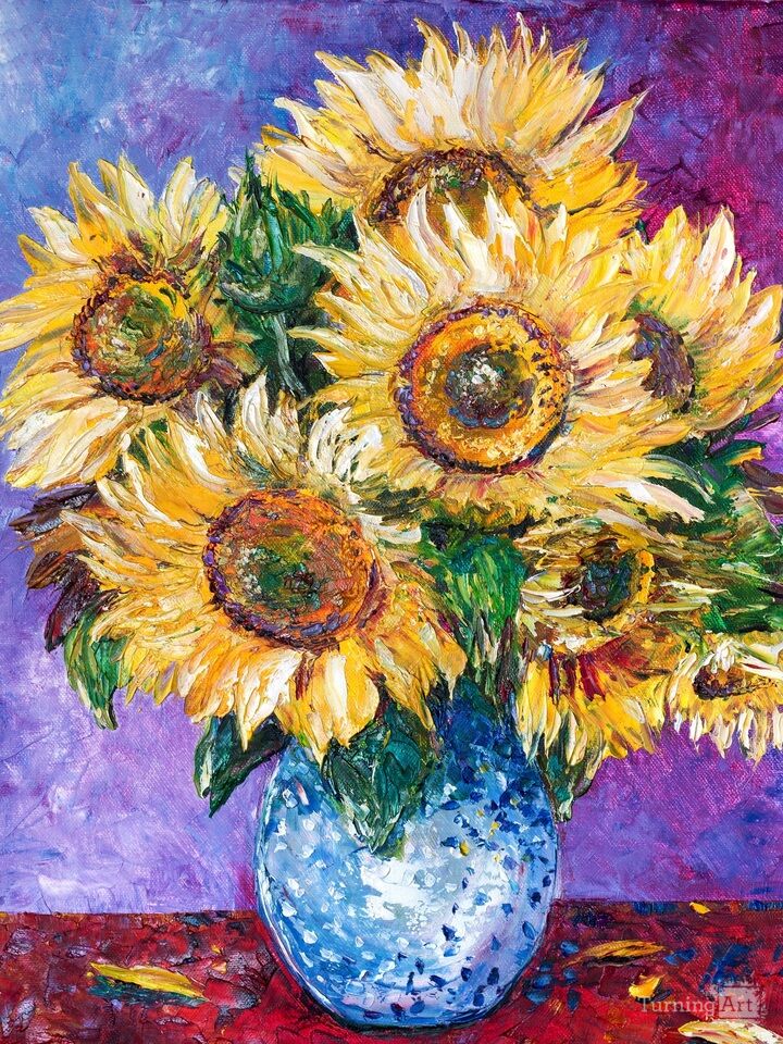 Another painting of my flower cycle. However, this work differs from the previous series: the canvas is enlarged, a different technique and a deeper color palette. Despite the preserved author's style, this painting with sunflowers turned out to be different from the previous ones. There is another philosophy in this work. As for the colors, I made all the elements very saturated, bright and deep. This gave the work volume and «weight». Oil, canvas, high quality varnish. Signed. Original.