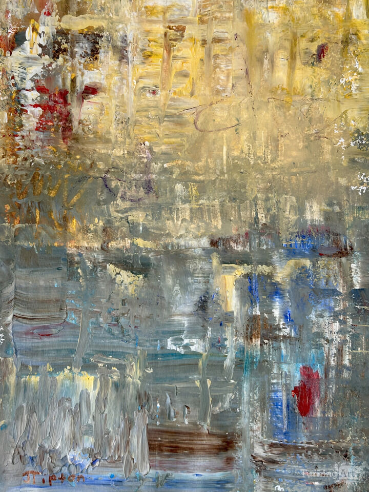 In Sunlight at Deep Quarry Lake, I sought to capture the fleeting, ethereal moments when day first touches the landscape and the water. The upper register, alive with vibrant yellows and muted golds, represents the initial burst of sunlight fracturing through the morning haze, reflecting off unseen surfaces and piercing the quiet. Below, the cool, expansive grays and blues evoke the deep, still waters of Deep Quarry Lake, its surface rippled by the faint movement of the waking world.