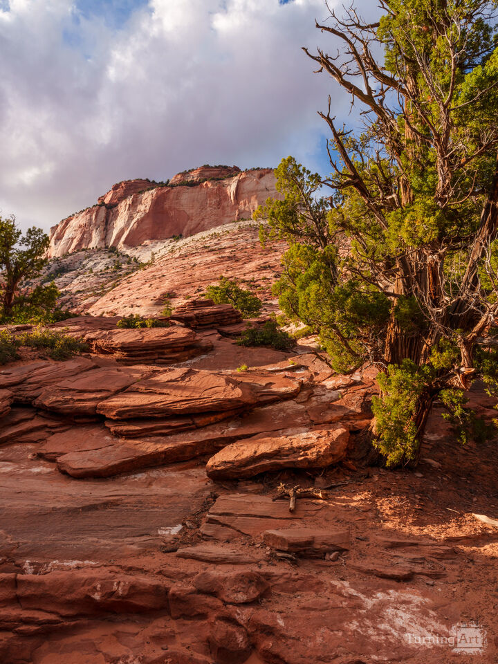 I captured this vertical photograph along the iconic Zion Canyon Overlook Trail in Zion National Park, Utah, USA, looking upward along the rugged mountainside. The warm evening sunlight casts glowing highlights and gentle shadows across the red rock cliffs, while a weathered juniper cedar tree clings to the edge of the slope. Soft clouds drift overhead, adding a touch of drama to this classic Southwestern landscape.