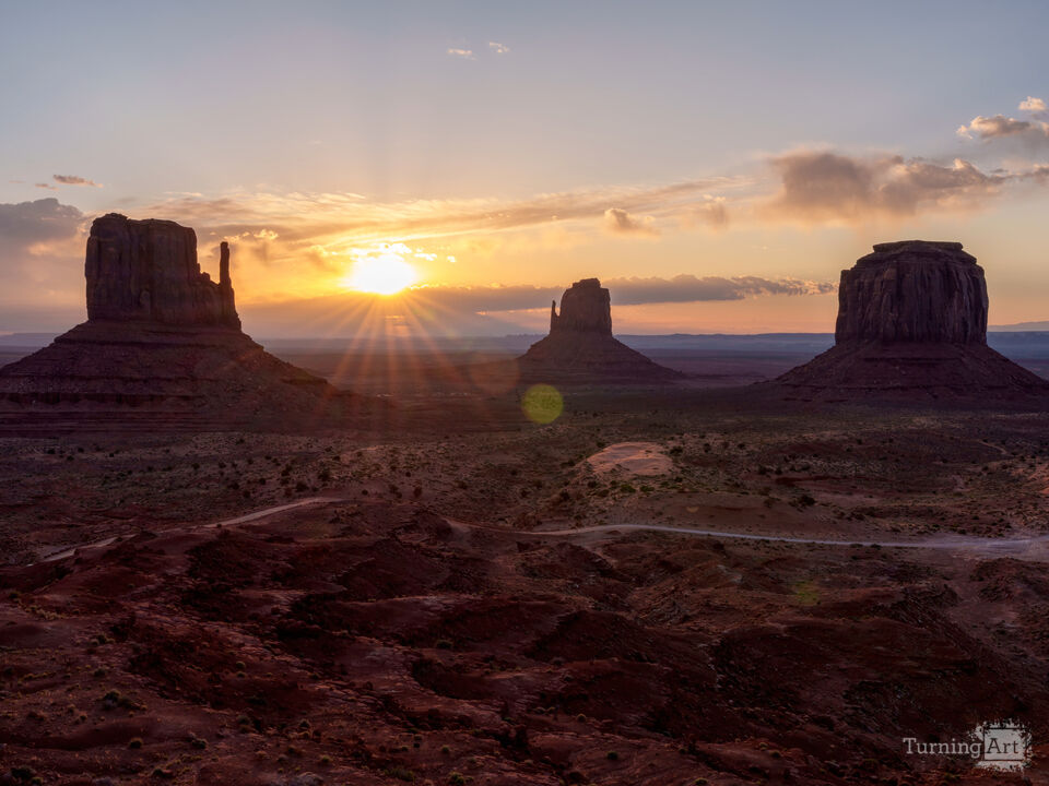 Golden rays of morning light break through scattered clouds at sunrise over Monument Valley in Navajo Tribal Park, located in northeast Navajo County, Arizona, United States. This bold desert landscape features the iconic silhouetted butte formations of the East and West Mittens alongside Merrick Butte. A winding dirt road cuts through the vast desert terrain, drawing the eye into the scene and emphasizing the scale of this legendary location. Often referred to as the 7th Wonder of Navajoland, Monument Valley offers a powerful and timeless view of the American Southwest.