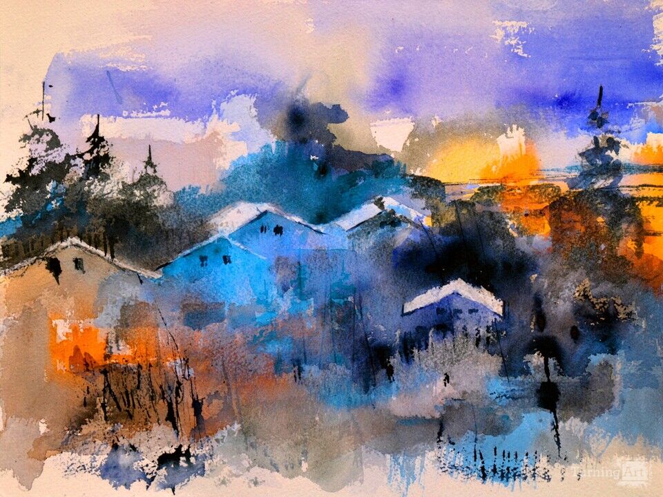 This captivating watercolor depicts an enchanting landscape at dusk. The blue and orange hues blend harmoniously, creating a dreamlike atmosphere. The delicate silhouettes of the trees contrast with the softness of the snow-covered rooftops, adding a poetic dimension to the scene. The play of light is skillful, suggesting a winter sunset that bathes the horizon in a diffuse, golden glow. The touches of color are precisely applied, evoking a light and fluid texture, while still leaving room for the imagination. The outlines of the houses can be glimpsed through a veil of mist, accentuating the mysterious effect. This work is distinguished by its perfect balance between abstraction and figuration, offering an emotive interpretation of the natural landscape. The choice of colors and mastered technique demonstrate great artistic sensitivity, captivating the eye and encouraging contemplation.