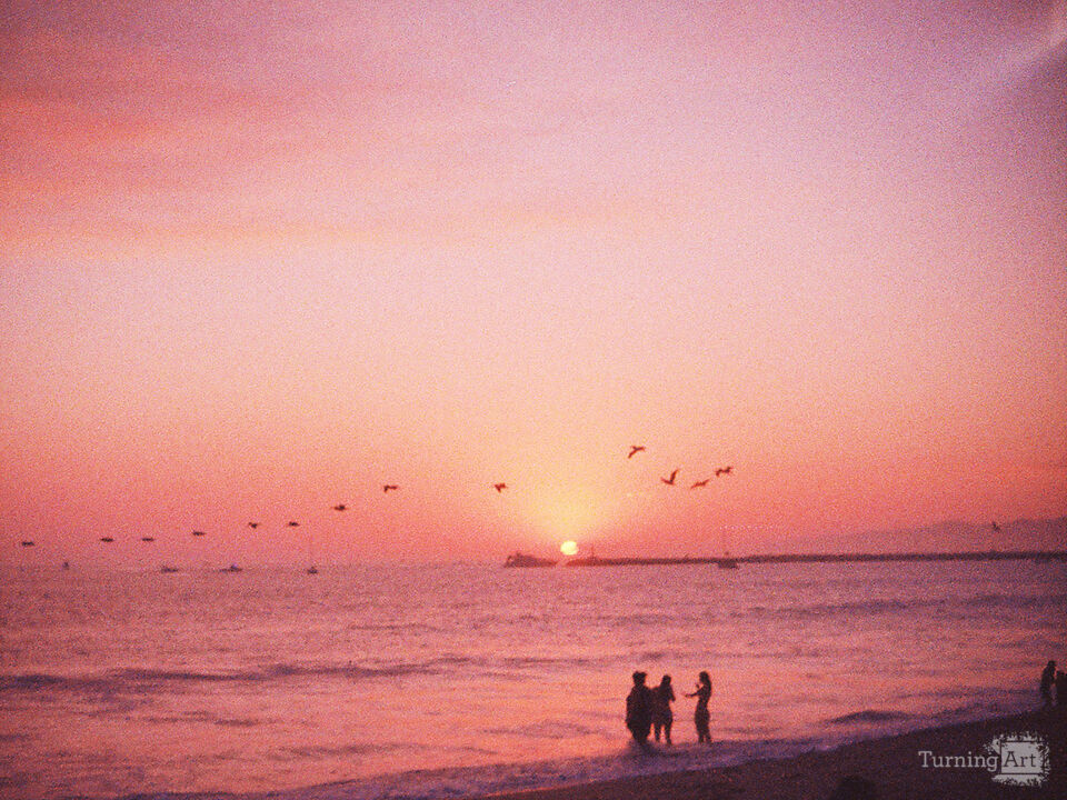 As the sun set along the Southern California coastline, I couldn't help but capture a moment where the vibrantly painted sky became a backdrop for a flock of birds and ocean lovers enjoying the view.