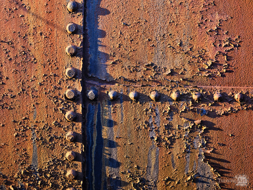 Sunset light brings out the textures and colors of rusting and peeling paint on rivets, nuts and bolts at the Bethlehem Steelworks in Pennsylvania