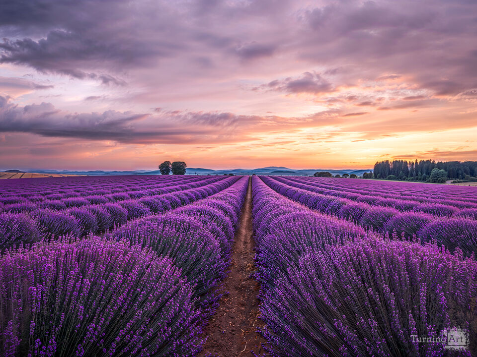 Endless rows of blooming lavender stretch towards the horizon under a colorful sunset sky. The vibrant purple hues contrast beautifully with the warm tones above. An idealized presentation of the French countryside that has been created with Ai plus additional digital editing in a photorealistic style.