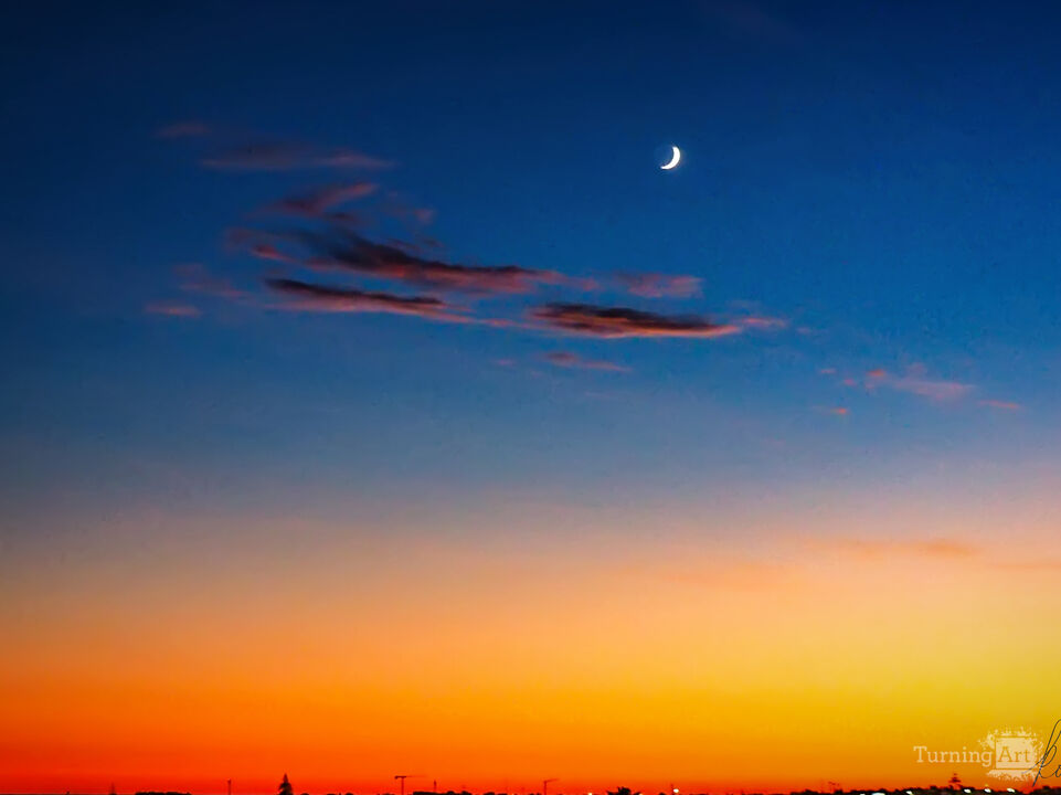 An image at sunset with a small waxing moon over the town of Tavira, in Portugal