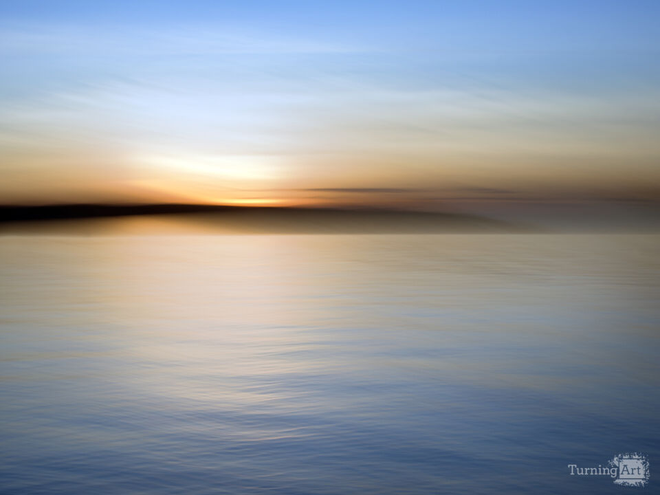 The Pacific Ocean at sunset has deep blue tones with the sun at the horizon. This fine art photography captures natural light with simple composition.
