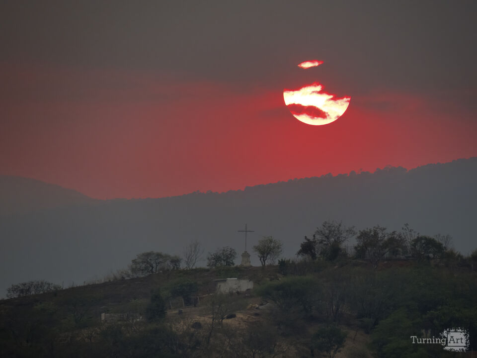 The sun setting above a hill with a cross. Just a minute before sunset, the sky is of a deep red.