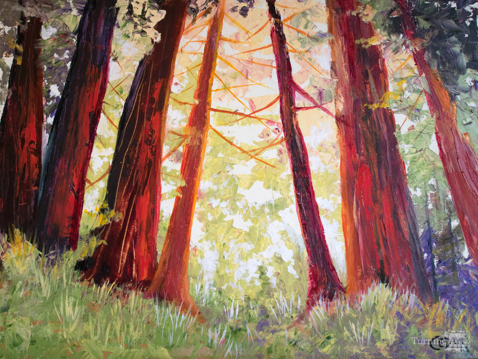 This painting evokes a feeling of pleasant warmth and joy. It brings with it a fantasy of childhood freedom, the carefree feeling of tromping through the woods, surrounded by birdsong. The space around the massive trees is filled with yellow sunlight. Summer grasses fill the foreground, framing the bright opening between the two center trees. In the distance beyond, washed out by the sun, there are hints of more foliage.