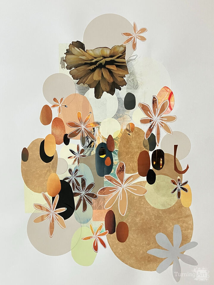 Using motifs of circles, ovals and florals, I hand-draw, cut and collage the elements together as if floating in space like objects on a mobile.