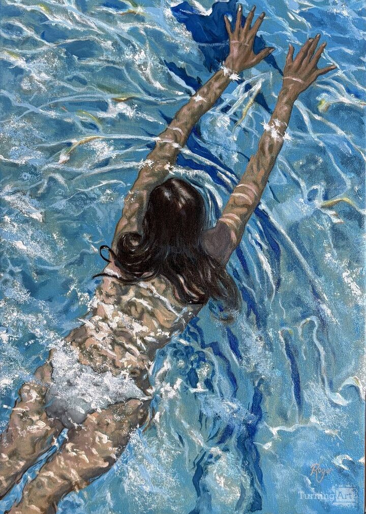 This oil painting measures 14” x 21”. The painting is a joyous splash into a swimming pool. The reflections exude the interplay of undulating waves and reflections of light on and under the water.