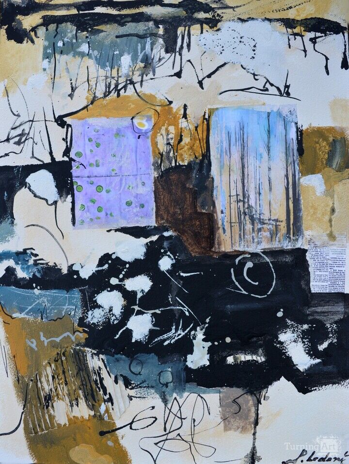 This rich and complex abstract work is distinguished by its bold juxtaposition of colors and textures. Dominated by shades of black, ochre, and blue, it incorporates graphic elements that create a captivating visual dynamic. Geometric shapes, notably the purple rectangle punctuated by circular patterns, contrast with the frantic brushstrokes, symbolizing controlled chaos. White splashes and black lines cross the canvas, adding depth and movement. A mysterious atmosphere emanates from the whole, provoking the viewer to reflect on the interplay between order and disorder. This composition evokes an exploration of the boundaries between controlled art and spontaneous expression, transporting the observer into a universe where the traditional limits of form are rethought.