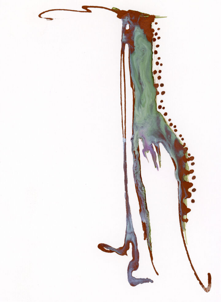 A tall, abstract form in earthy tones appears with fluid hints of green and brown. Small dots run along one side, adding to the movement of the design. This series was done on oil painting paper which allowed the ink to sit on the surface without diffusing. Thanks for looking and I hope you enjoy it!