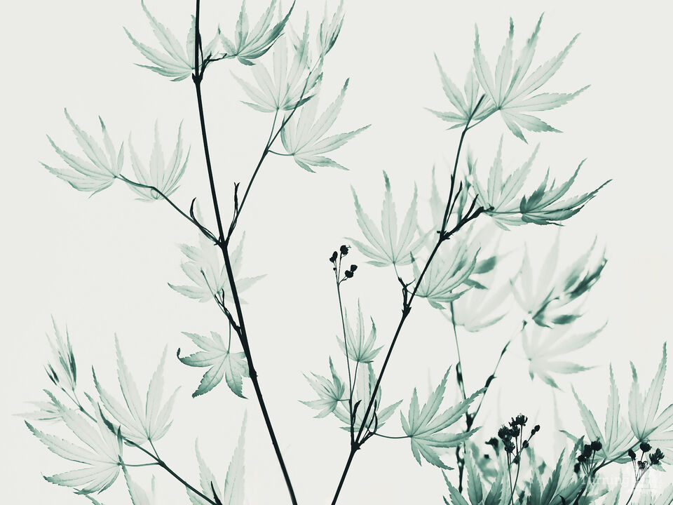 Observation of a spring branch of fresh leaves is captured in natural light with a solid grey background.