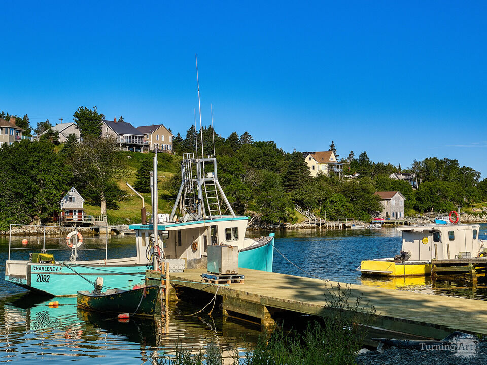 A Teal green and a yellow lobster fishing boats on the shore of Idyllic Bouteliers Cove on St. Margaret's Bay in Nova Scotia Canada's Eastern Atlantic province