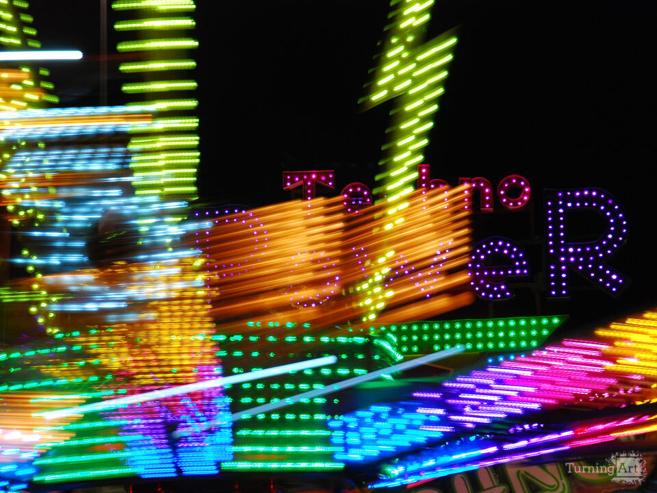 The energetic, frantic neon lights of a carnival ride at the State Fair of Texas.