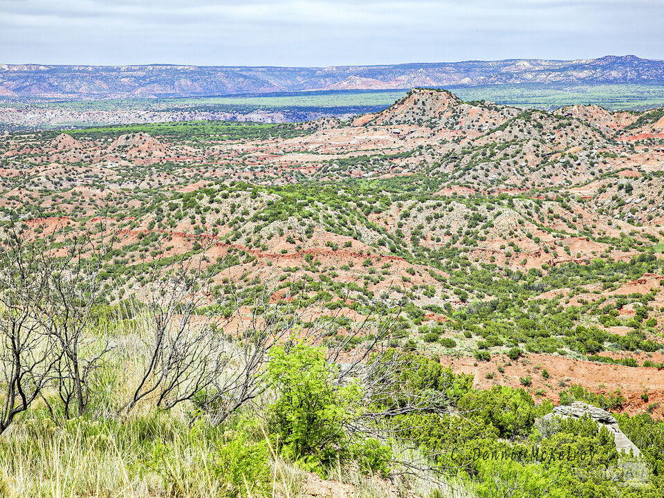 Overview of the Texas Grand Canyon. Natural painted canyon walls and cap rock in the distance. Nice sky to accent the mix with some shadows on the distant plain.