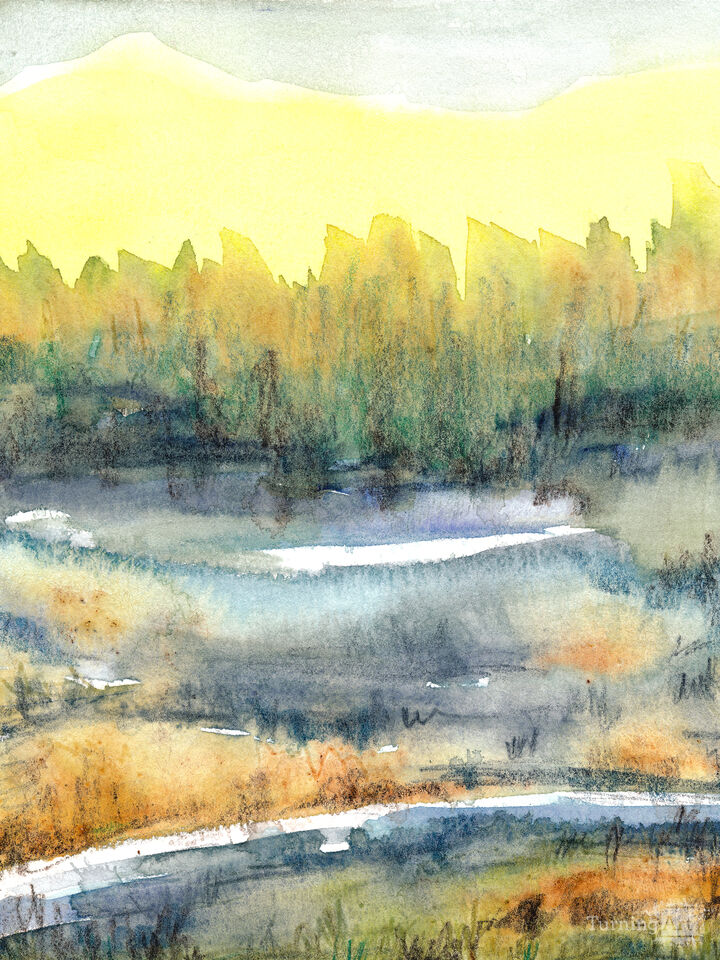 Soft landscape painting of the colors and textures of the Texas Hill Country. Earthy colors of scrubby vegetation against sunny hills.