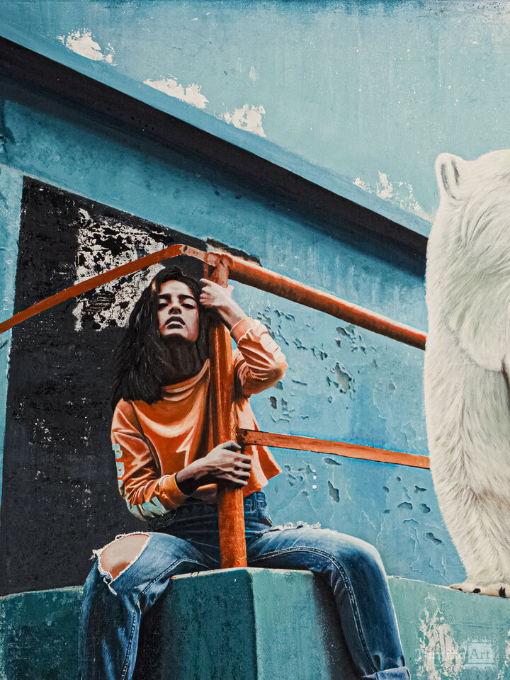 The background dominated by weathered concrete in blue tones reinforces the seriousness of the image. It is a symbol of the act of man and the degradation of the environment. The polar bear that clearly does not belong there is evidence of climate change.