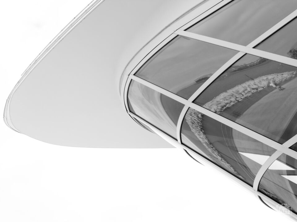 The photo is taken from a tilted, low angle, emphasizing the dynamic curves of the structure. A large, circular window with a grid of white frames dominates the composition, creating a sense of pattern and depth. The curved shape of the window and the roofline above it gives the building a distinct, almost organic feel. The high-contrast black and white processing highlights the clean lines and smooth surfaces of the architecture, from the bright, curving walls to the darker reflections within the glass. The reflection in the window appears to show the jagged, textured surface of the museum's "Burke Brise Soleil," the iconic, wing-like sunscreen that opens and closes daily.