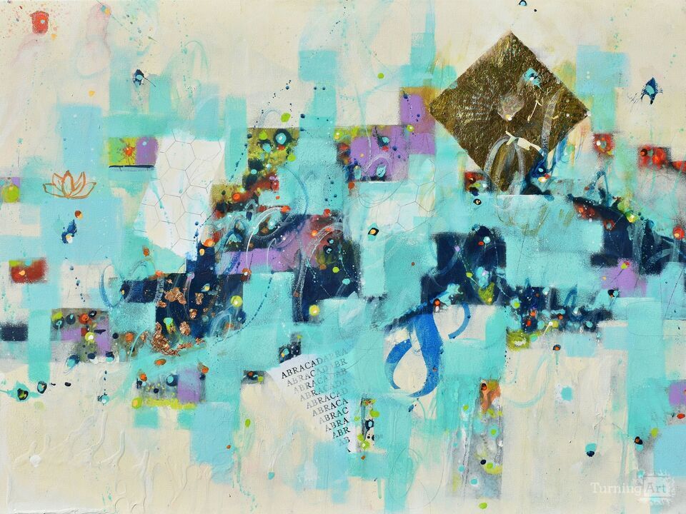 The City Sings To Me is inspired by themes of transformation, possibility, and the boundless nature of existence. Geometric forms and layered collage with gold and copper leaf draw symbolic threads from Buddhism, astrophysics, and space-time theory, reflecting how we shape and interpret our reality, scientifically, spiritually, and creatively. The word abracadabra “I create as I speak” appears as a reminder that our thoughts are acts of creation. The number eight symbolizes abundance, success, and the infinite balance between the material and spiritual realms, reminding us that life is not merely a journey but an ever-unfolding force of creation.