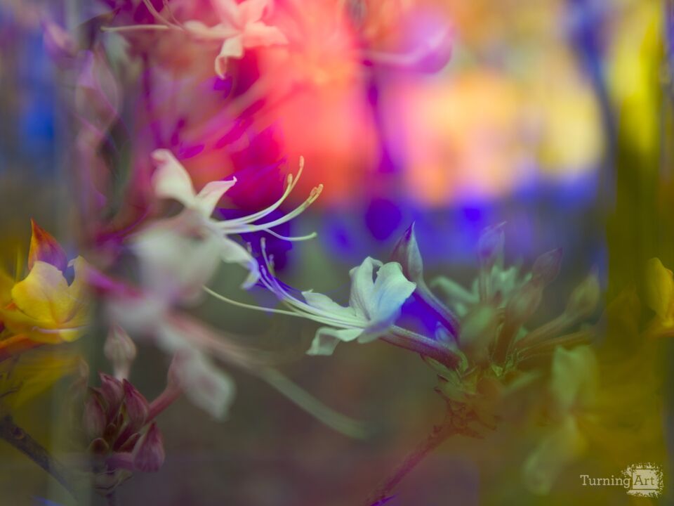 This prismatic photograph, titled "The Creation of Azalea," captures a cluster of azaleas in a vibrant, symbolic moment, their delicate petals reaching toward each other in a gesture reminiscent of Michelangelo’s Creation of Adam. The prismatic effect bathes the flowers in a radiant spectrum of blues, purples, yellows, and pinks, creating a shimmering, almost divine glow that enhances the sense of connection between the blooms. The background, a swirling blend of warm and cool tones, adds a dynamic energy, as if the azaleas are sparking to life in a colorful, ethereal garden. The interplay of light and color evokes a sense of creation and unity, mirroring the iconic touch of life in the famous fresco.