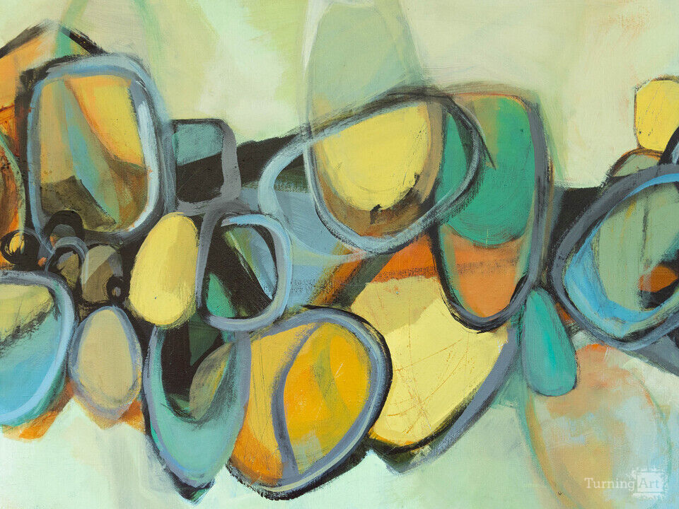 The Eyes Have It presents a lively exploration of shape and color, where rounded, organic forms come together in an unexpected yet harmonious dance. Outlined crisply in black, these irregular ovals and gentle curves cluster and overlap, creating a sense of movement that feels both spontaneous and thoughtfully composed. The palette—featuring muted yellows, turquoise, soft oranges, greens, and pale blues—offers a fresh and inviting mood, balancing warmth and coolness in a way that keeps the eye engaged. Against a light, softly washed background, the arrangement feels airy and unconfined, with visible brushstrokes adding texture that invites closer inspection. This piece celebrates the joy found in rhythm and flow, making space for curiosity and quiet energy to coexist.