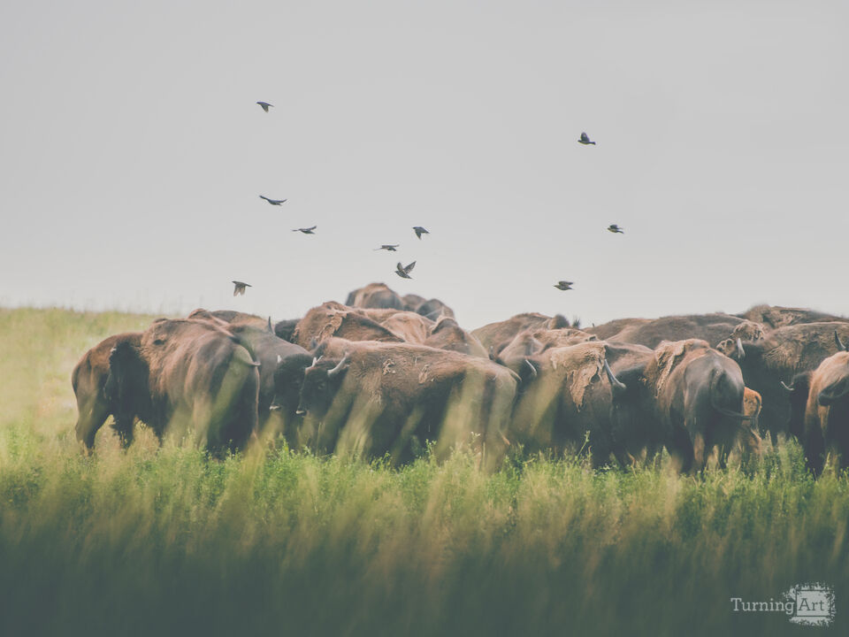 This photograph captures a powerful moment of movement and stillness on the American plains. A massive herd of bison moves through a lush, green field, their heavy forms partially veiled by the soft, tall grasses in the foreground. The image is defined by a beautiful sense of scale and atmosphere, capturing the bison huddled together, their dark, textured coats creating a grounded, earthy presence.