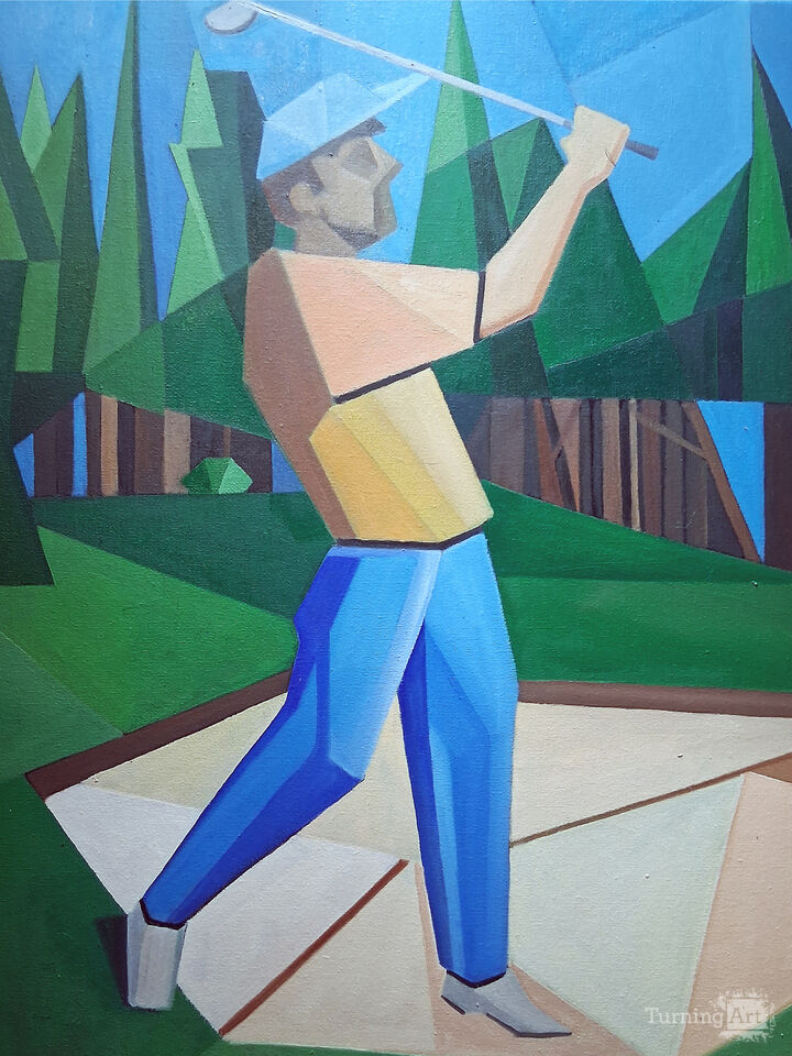 A structured approach at a golfer in full swing. Capturing the movement of the human body with a cubed or linear technique. Painting the background and sand trap with the same linear, square, technique.