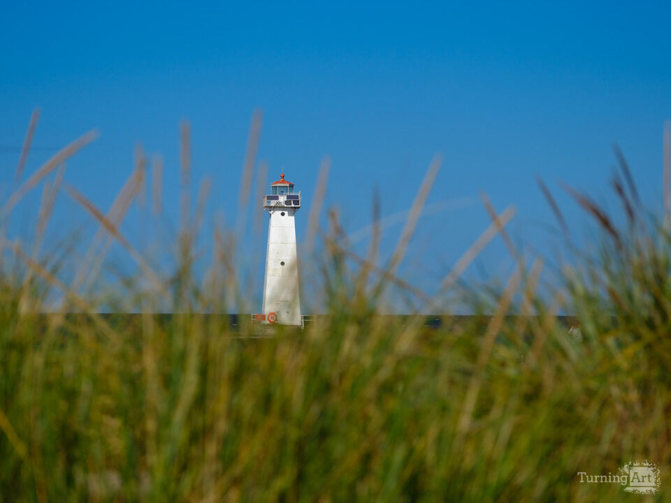 Beautiful afternoon on Lake Ontario in New York with the Sodus Point Lighthouse and the beautiful blue lake waters seen through the tall dune grasses on the beach