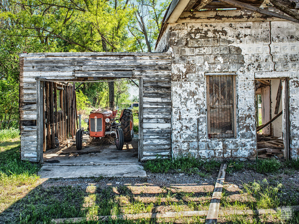 A vintage red Massey Ferguson tractor sits inside the open bay of a crumbling, paint-peeled farm building, framed by weathered wooden beams and bathed in warm summer light filtering through the open structure. The lush green trees visible beyond the building and the dappled light on the concrete floor suggest a summer afternoon of striking beauty, in sharp contrast to the building's state of decay. The tractor — sturdy, red, and apparently still intact — seems to be quietly waiting, a survivor amid the ruin of the structure around it. This is a richly nostalgic Americana image with wide appeal, evoking rural life, agricultural heritage, and the passage of time.