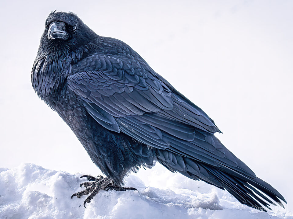Ravens have lived along the shores of Jackson Lake since long before Grand Teton National Park existed. They know this place in a way that no visitor ever will, and they carry themselves accordingly. With it's steel-blue feathers against the stark snow, ancient talons gripping the ice, and sharp, direct eyes, the wildlfe portrait of this raven embodies calm, absolute authority over its environment.
