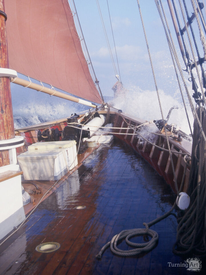 Large waves crash across the deck of the schooner Roseway as the vessel pushes through rough offshore seas. Water surges over the rail and across the wooden deck while the rigging strains in strong wind. Built in 1925, Roseway is a historic Gloucester fishing schooner that once worked the offshore fisheries of New England. The perspective places the viewer directly on deck as the ship drives forward through heavy ocean conditions. Scenes like this reveal the power of the sea and the demanding nature of traditional sailing vessels. The photograph captures the raw experience of life aboard a classic schooner under challenging weather at sea.