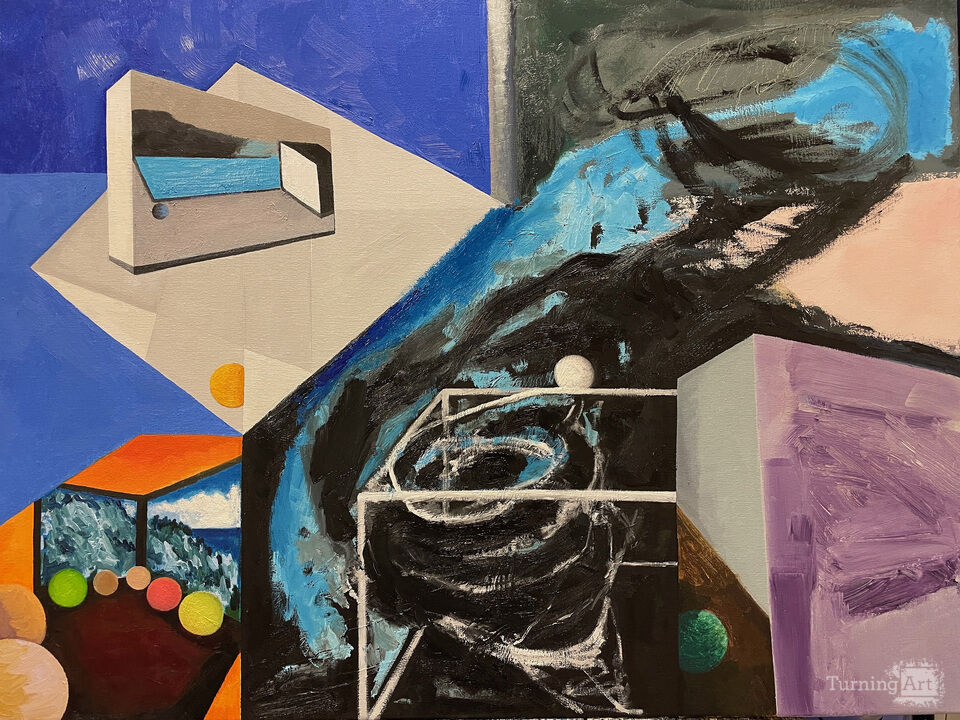 The Space Between depicts a tornado and rushing water through an abstract city. It is juxtaposed with an interior that feels warm and intimate, a calm, distant landscape seen through a window. The upper left shows a blue rectangle, representing a pool, a form of contained water rather than a flood. It sits in a larger rectangle, which suggests a billboard, making the pool like an advertisement for a vacation destination impervious to disaster.