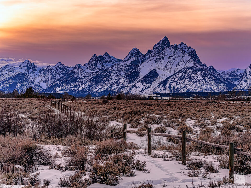 Few mountain ranges command the horizon quite like the Tetons — and on this late January evening, they delivered something truly extraordinary. Standing alone on the frozen sagebrush flats of Grand Teton National Park, temperatures well below freezing, I waited in silence for the sky to respond. At the last possible moment, it did. As the cloud cover broke near the horizon, a warm peach and amber glow ignited the sky behind these cathedral peaks. The weathered ranch fence traces a quiet path through the snow-covered flats, guiding you towards these majestic peaks that rise abruptly nearly 7,000 feet straight from the valley floor. Against this stunning sky the snow-draped Tetons looked wilder and more rugged than ever— their jagged silhouettes glowing against the fading dusk.