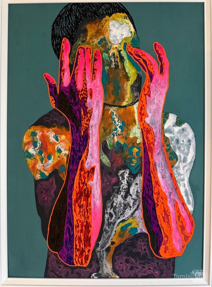 Acrylic and oil on panel with a white wooden frame, 72×52cm and ready to hang.