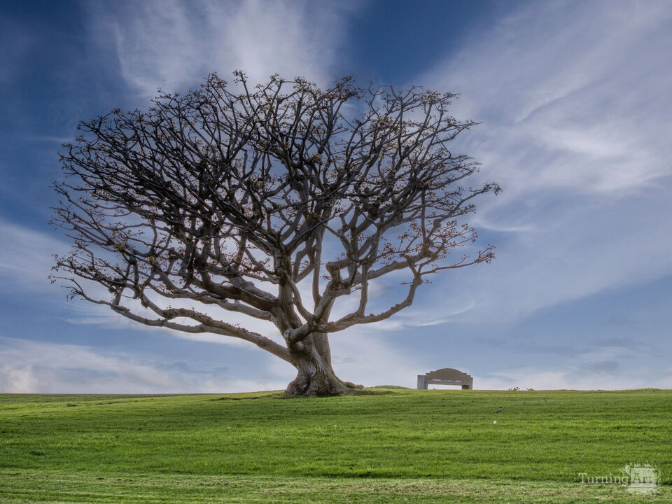 A magnificent, broad-canopied tree dominates the horizon of a lush green hillside, its bare but intricately branching limbs spread wide against a vivid blue sky laced with wispy clouds. A solitary park bench sits quietly in the distance, suggesting contemplation, rest, and the quiet pleasure of being outdoors. The interplay between the tree's dense tracery of branches and the expansive sky above gives the image a feeling of openness and possibility. This warm, inviting photograph captures a universal human experience — the comfort found in a single, magnificent tree — and translates it beautifully for home or office walls.