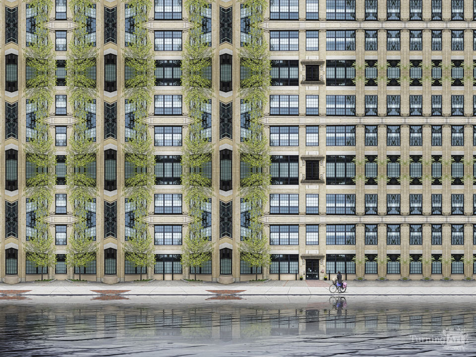 The artwork is part of a series, titled Unreal Reality, in which an original photograph, shot on location in various international cities, is digitally blended with the elements taken from the edges of the frame to create an expanded cityscape surrounding the subject. The outward growth of frame is accomplished by utilizing the Fibonacci based sequence of numbers to produce aesthetically pleasing patterns. The project is a subjective approach to photography favoring perception over seeing. It is meant to re-invent viewer’s relationship with the reality of the outside world around him/her. This deviation from the norm of realism are emphasized by these large-scale artworks, depicting urban landscapes containing spaces with vast perspectives where buildings soar above the human scale and architectural elements unique to each city produce one of a kind geometric pattern.